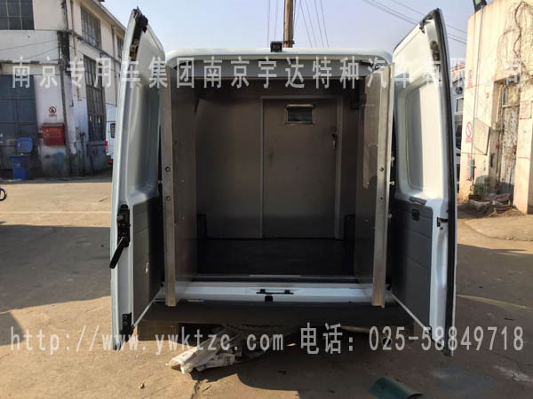 该车选用江铃经典全顺短轴中顶这款车进行改装,整车整体为白,下保险杠为深蓝颜色,喷押运警示标识,原车的空调系统、多媒体播放系统,原中侧拉门改为中推拉门并配备中控门锁,2+1三人押运员座椅,第三座椅可翻折,两点式安全带,驾驶舱电动升降射击口兼票据传递口,押运舱暗藏式射击口,手动通风逃生天窗,中隔断带滑动式隔离门,无锌花镀锌板钞箱内板,两侧内板瓦楞状,花纹钢板轮罩,运钞舱花纹钢板地板,双层双开钞箱后门使得整个过程中更安全,钞箱后门多项锁,车尾后踏板,可切换双镜头彩色监控系统(倒车以及运钞舱监控图像)半球监控摄像头,前防护保险杠,警报器,整车押运车及驾驶舱全为防弹,达到国家防弹A级标准。