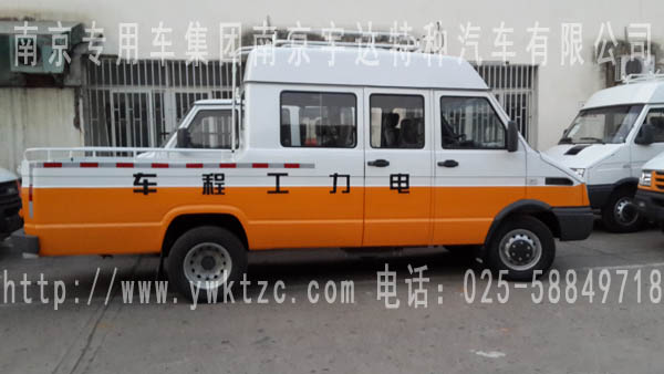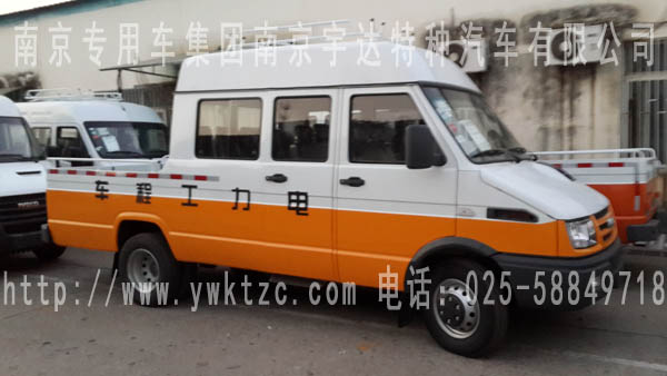 该车选用依维柯老款得意款底盘进行改装,整车上白下黄,后爬梯,车顶行李架,贴有电力工程车字样,标准电力工程车,整车座位为三排座,副驾驶双人座,后面一排为四人座,中间俩座加一边座,这个格局,使得整车小于6米,座位属于9+1座,这样该车可以上蓝牌,C1驾照就可以驾驶,尾门为双开门,方便施工过程中上下货工具等物品。操作要求简单,驾驶要求低,价格便宜,性价比高,依维柯具有动力强,爬坡能力高,承重能力强,底盘通过性好,省油等优势。