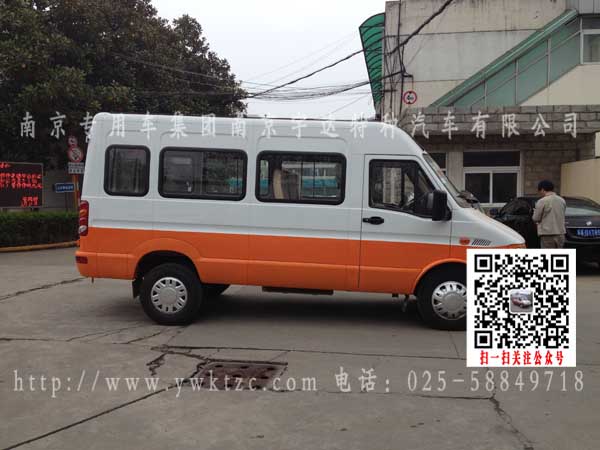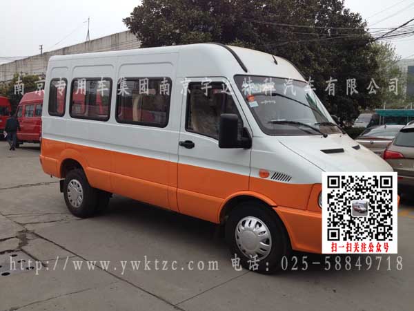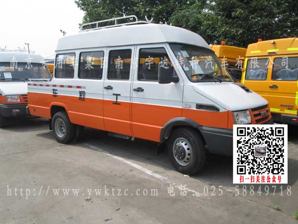 依维柯NJ5054XGCA得意款15座工程车,该车外形尺寸6450×2020×2720 (mm) 货厢尺寸:1615×1840×595(mm) 发动机SOFIM8140.43S4 发动机生产企业 南京依维柯汽车有限公司 排量(ml)2798 功率(kw)95 燃料种类:柴油(mm) 总质量:5200(Kg)整备质量: 2958(Kg)额定质量:1535 (Kg) 额定载客13(人)接近角/离去角: 22.5/9.5(°) 前悬/后悬:960/1930(mm)轴荷:1700/3500轴距:3600(mm)轴数:2 最高车速:125(km/h) 弹簧片数:-/8轮胎数:6 轮胎规格:6.50R16LT前轮距:1683后轮距:1540转向形式:方向盘 依据标准:GB17691-2005国Ⅳ,GB3847-2005.