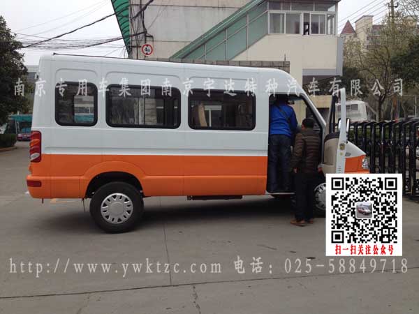 副驾驶双人可翻座椅、第二排4人座椅、后双开门、后上车踏板、车辆外观为上百下黄。