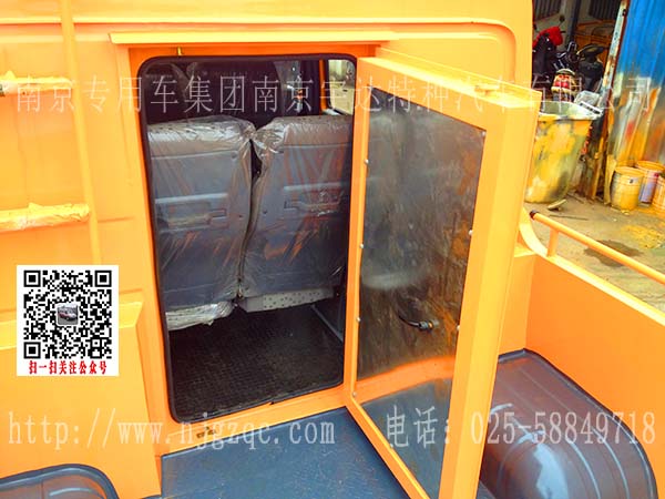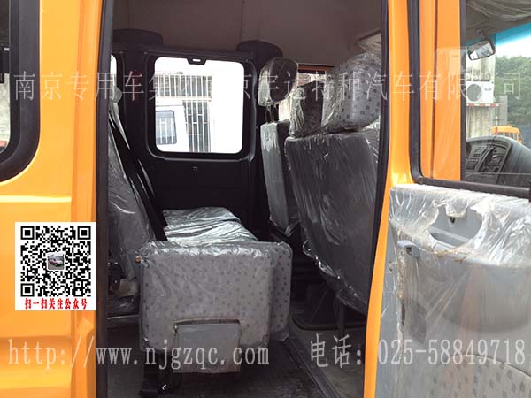 该车改装外观全黄;车顶行李架;后排体;车厢后开门;贴电力工程车字样,后门座位可拆卸换翻板座椅。
