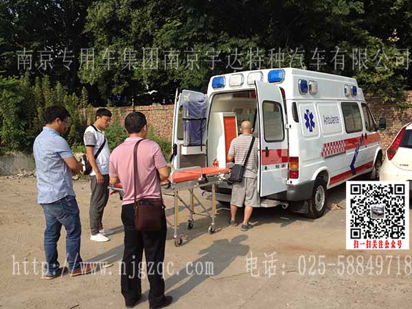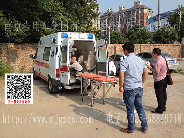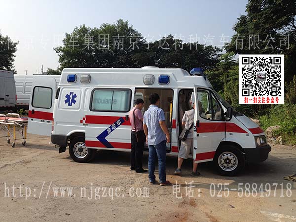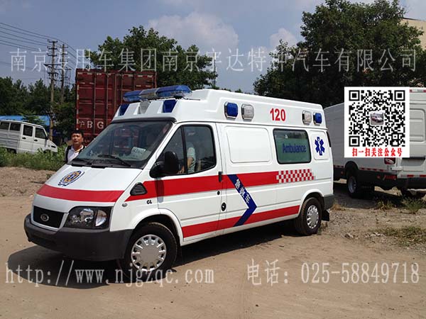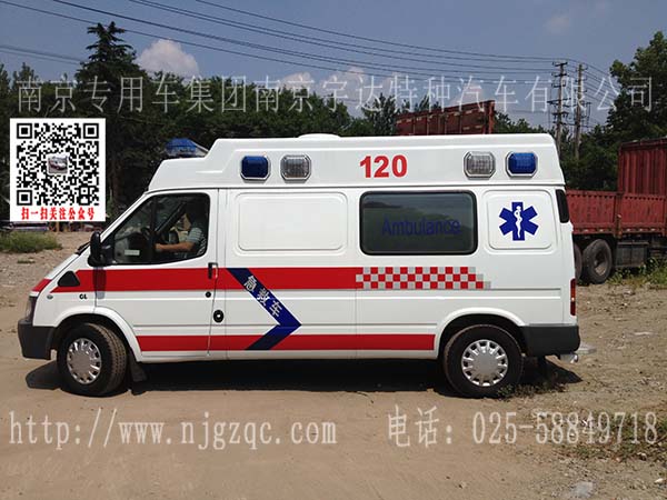 国际流行救护车方顶及外型;玻璃钢一体式模具内饰;长条警灯;爆闪灯;照明;灯密封中隔断;医生座椅;3张单人座椅;自动上车担架;折叠担架;2个10升氧气瓶;前后对讲系统;逆变电源系统;医疗柜;紫外线消毒灯;排风系统;照明系统;内饰系统;医用地板;前后2个输液挂钩;侧门上车扶手;担架仓;车身广告系统(客户供样)。