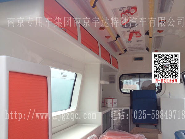 该车中隔断带移窗、前后对讲机系统、紫外线消毒系统、空调冷暖系统、医疗舱侧壁照明系