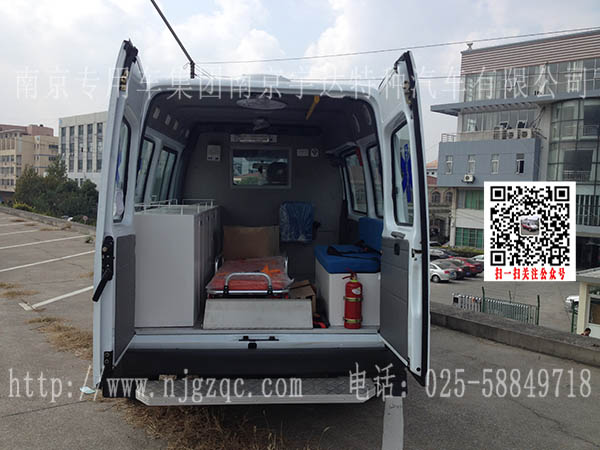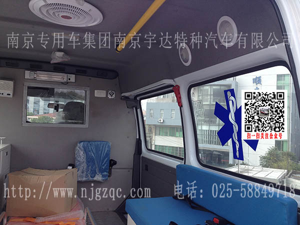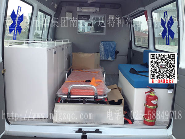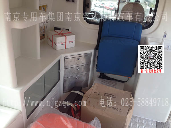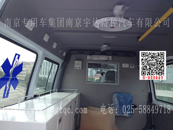 配备爆闪灯、中隔断把整车分为驾驶室,医疗室,配备医生座椅、家属座椅、自动上车担架、